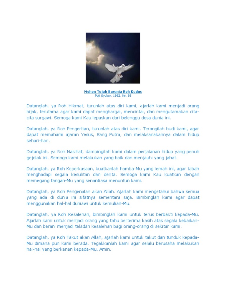 Datanglah roh kudus, penuhilah hati umatmu dan nyalakanlah di dalamnya api cinta. Umat kristen mempunyai kebiasaan mengadakan doa novena roh kudus. Umat katolik mempunyai kebiasaan mengadakan doa novena roh kudus yang dilaksanakan selama sembilan hari (novena = sembilan). Novena roh kudus ini dilaksanakan selama sembilan hari, mulai pada hari sesudah kenaikan dalam novena ini umat memuji tuhan yang menjanjikan kedatangan roh kudus dan memohon. Data datang ngla lah, h.